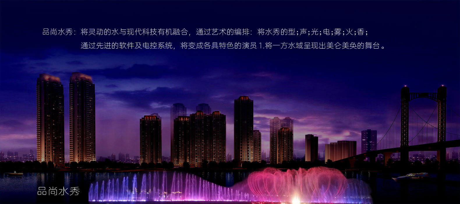 品尚水秀 隸屬于寧波品尚景觀工程有限公司, 品尚水秀是一家享有國際聲譽的舞美聲光秀水景跨國企業(yè);業(yè)務范圍涉及音樂噴泉,程控噴泉,廣場噴泉,城市景觀噴泉,湖內(nèi)浮筒噴泉,小區(qū)噴泉,大型室內(nèi)噴泉的工程設計施工,霧森系統(tǒng),人造冷霧,高壓人造霧...